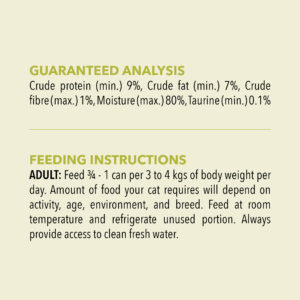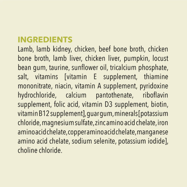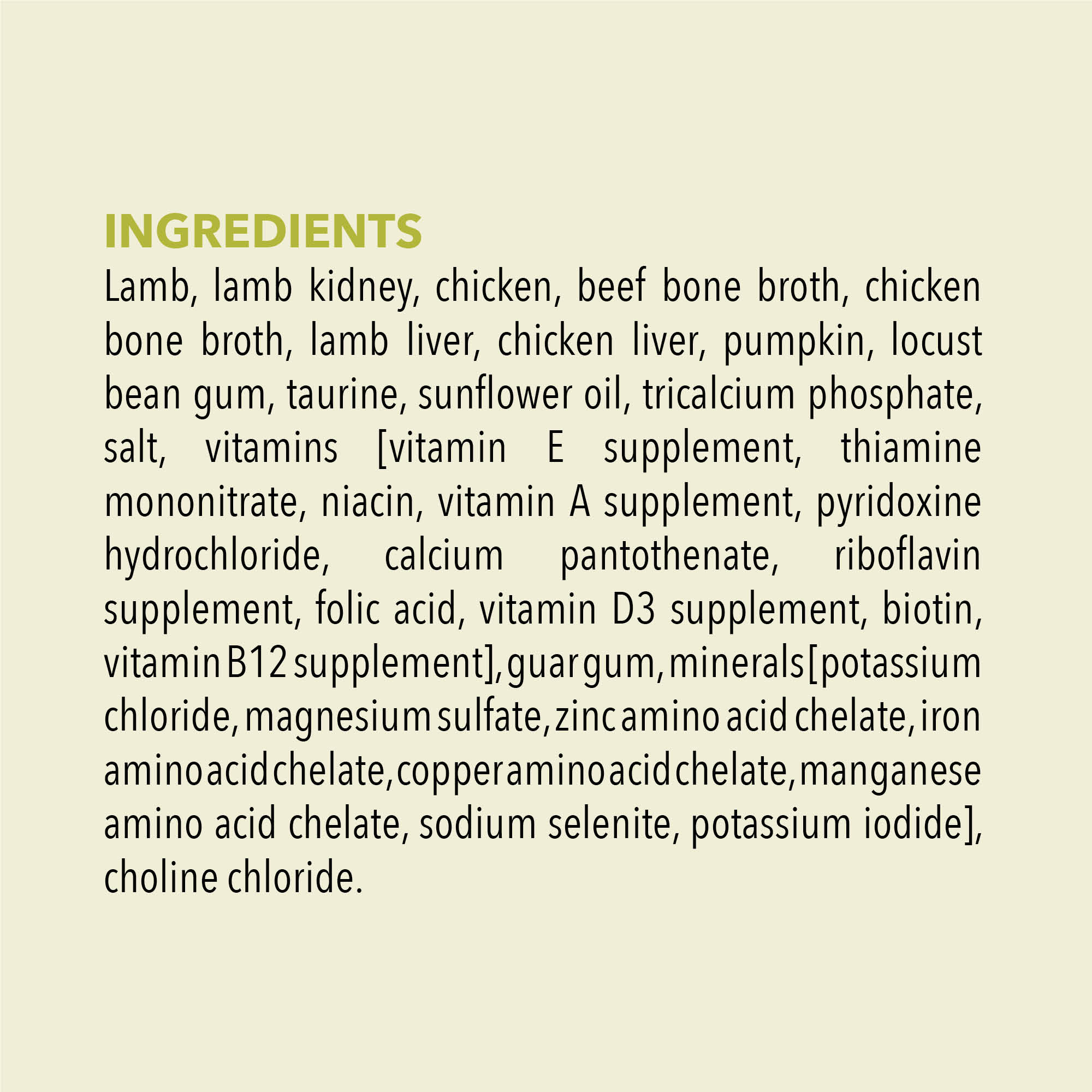 Lamb, lamb kidney, chicken, beef bone broth, chicken bone broth, lamb liver, chicken liver, pumpkin, locust bean gum, taurine, sunflower oil, tricalcium phosphate, salt, vitamins [vitamin E supplement, thiamine mononitrate, niacin, vitamin A supplement, pyridoxine hydrochloride, calcium pantothenate, riboflavin supplement, folic acid, vitamin D3 supplement, biotin, vitamin B12 supplement], guar gum, minerals [potassium chloride, magnesium sulfate, zinc amino acid chelate, iron amino acid chelate, copper amino acid chelate, manganese amino acid chelate, sodium selenite, potassium iodide], choline chloride. Crude protein (min.) 9%, Crude fat (min.) 7%, Crude fiber (max.) 1%, Moisture (max.) 80%, Taurine (min.) 0.1%
