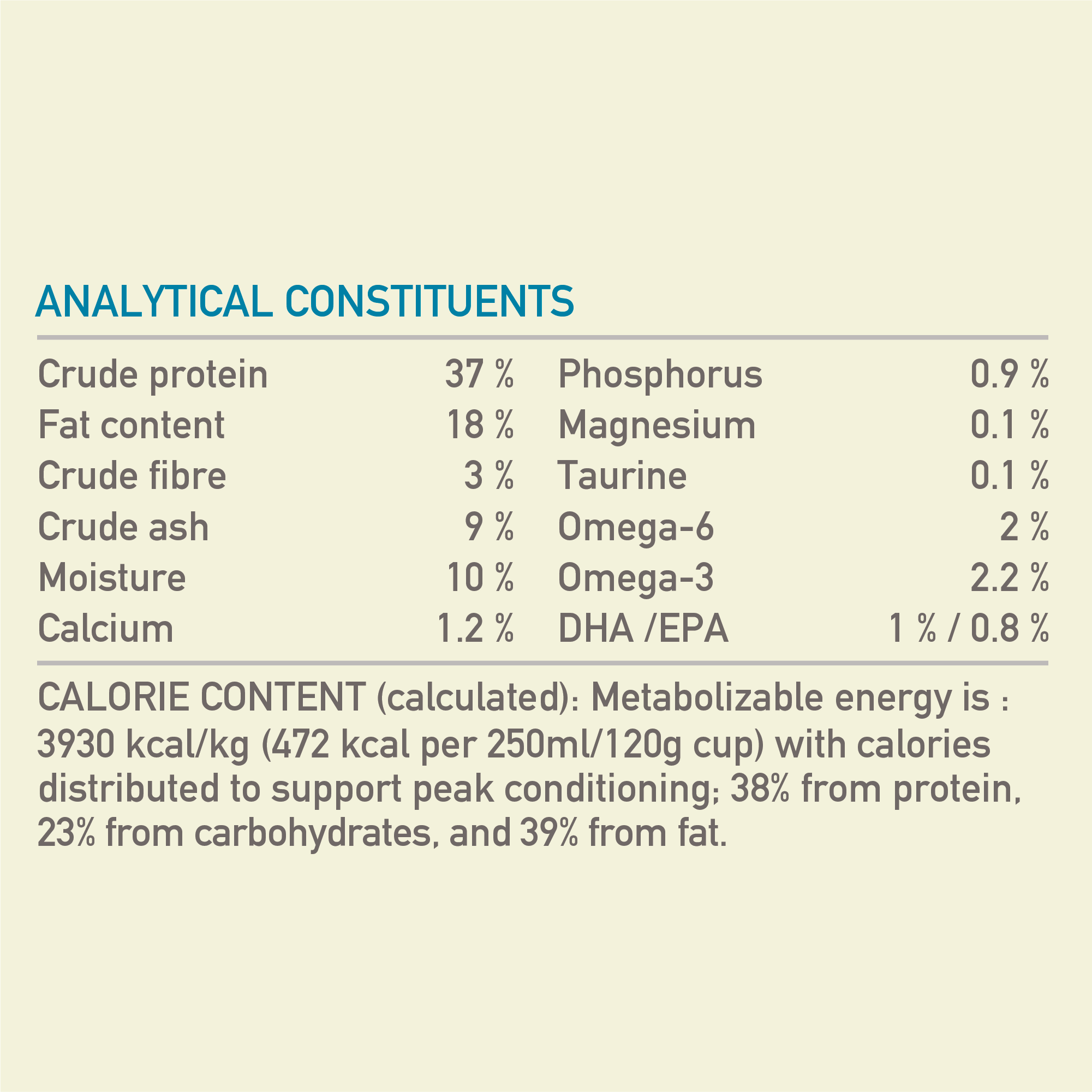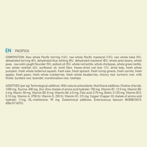Raw whole herring (16%), raw whole mackerel (12%), raw hake (9%), herring meal (8%), blue whiting meal (8%), mackerel meal (8%), whole pinto beans, whole peas, raw flounder (5%), fish oil (5%), whole red lentils, whole chickpeas, whole green lentils, raw rockfish (4%), sunflower oil, lentil fibre, dried kelp, fresh whole pumpkin, fresh whole butternut squash, fresh whole carrots, fresh whole apples, fresh whole pears, fresh whole zucchini, dried chicory root, fresh kale, fresh spinach, fresh turnip greens, fresh beet greens, whole cranberries, whole blueberries, whole saskatoon berries, turmeric root, milk thistle, burdock root, lavender, marshmallow root, rosehips ADDITIVES (per kg): Technological additives: Tocopherol extracts from vegetable oils: 121 mg, citric acid: 40 mg. Sensory additives: Rosemary extract: 80 mg. Nutritional additives: Choline chloride (choline): 1400 mg, Taurine: 400 mg, Zinc proteinate: 160 mg, Copper proteinate: 11 mg, Vitamin B1: 12.5 mg, Vitamin B2: 10 mg, Vitamin B3: 50 mg, Vitamin B5: 8 mg, Vitamin B6: 6.5 mg, Vitamin B9: 0.75 mg, Vitamin B7: 0.13 mg, Vitamin B12: 0.1 mg, Vitamin K3: 0.5 mg, Vitamin A: 3750 IU, Vitamin D3: 500 IU, Vitamin E: 50 IU, Vitamin C: 12.5 mg, DL-methionine: 99 mg. Zootechnical additives: Enterococcus faecium DSM 10663/NCIMB 10415: 1 x 109 CFU.