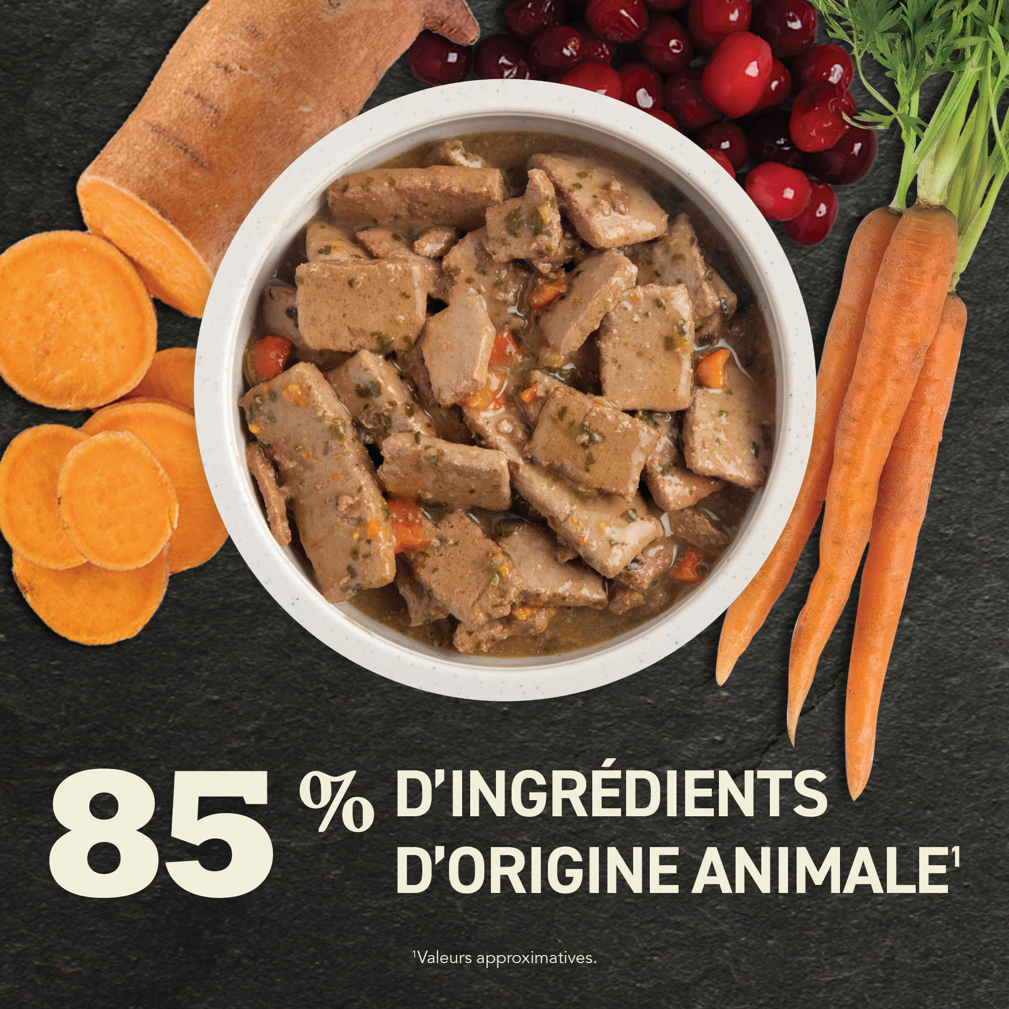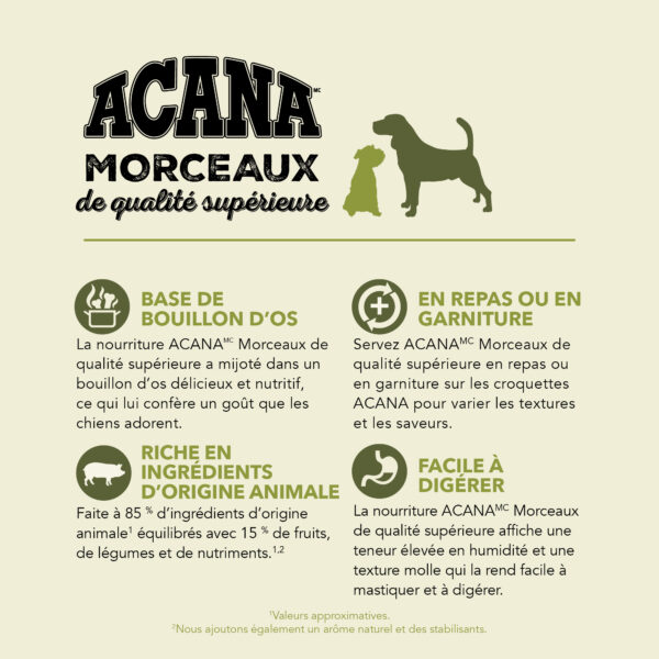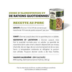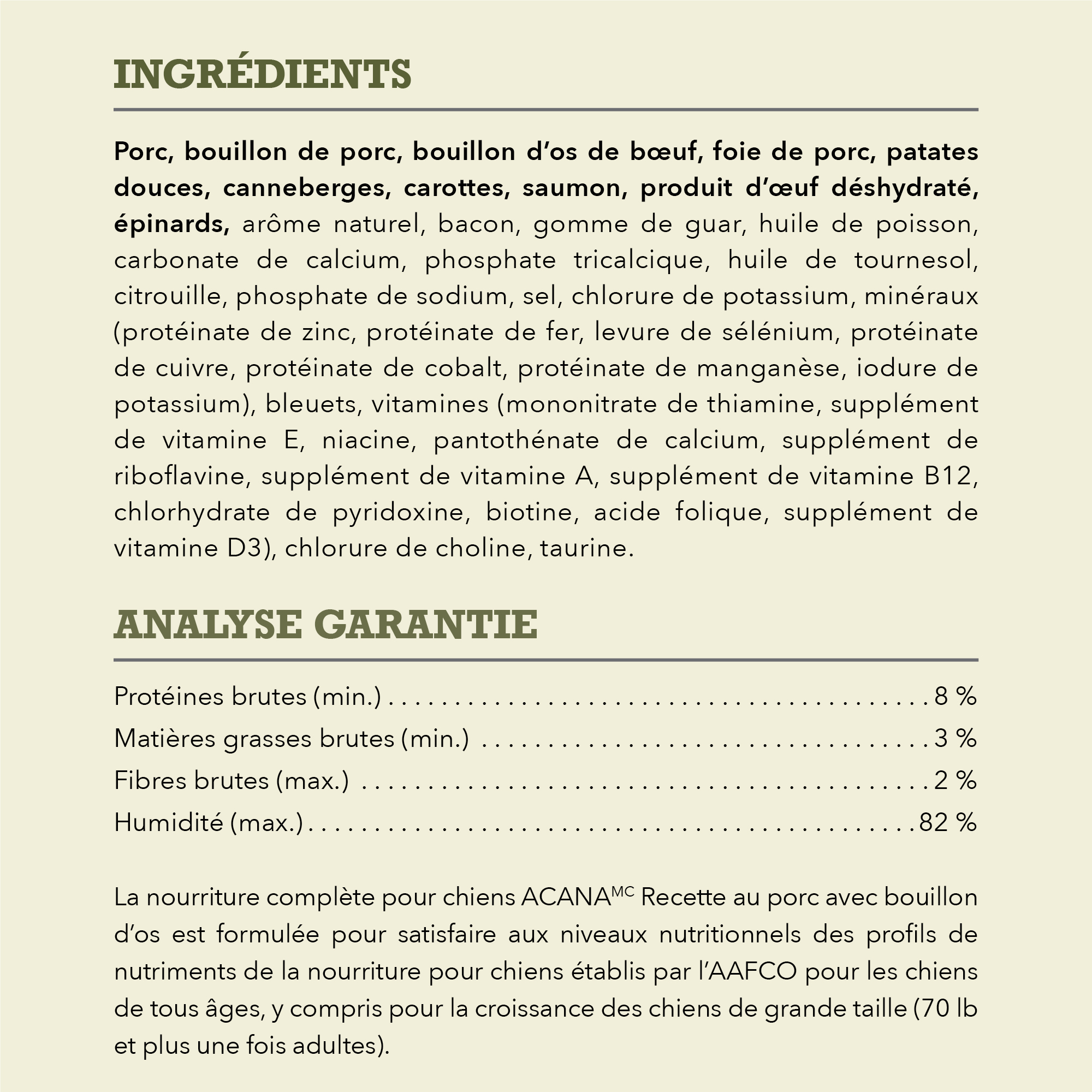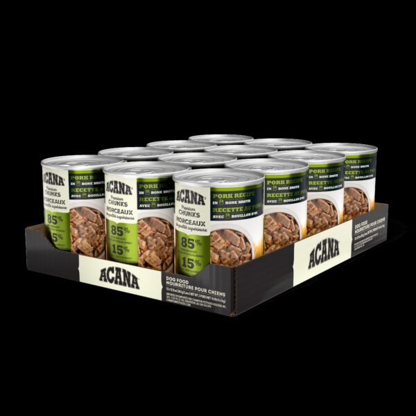ACANA food for dogs always Goes Beyond The 1st Ingredient™, and every can of ACANA Premium Chunks is crafted thoughtfully from start to finish. Our Pork Recipe in Bone Broth is crafted with 85%* animal ingredients in the form of premium chunks of pork. It’s also balanced with 15%*† visible fruit and vegetables in a savory bone broth base your dog will love. Add it as a topper on your dog’s favorite ACANA kibble to provide them with more hydration and crave-worthy flavor, or feed alone for an indulgent treat at mealtime. *Approximate and derived from the unprocessed state of the ingredients †We also add essential vitamins and minerals, natural preservatives and probiotics