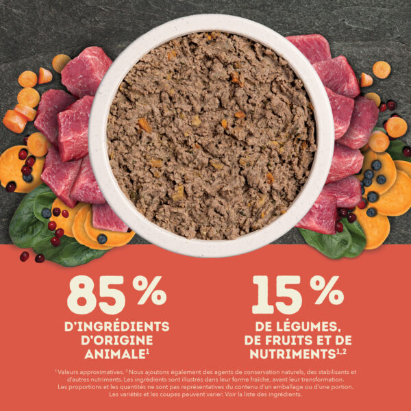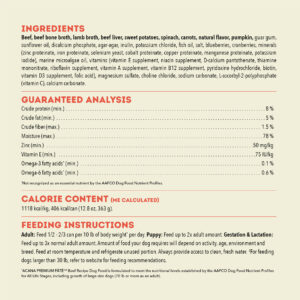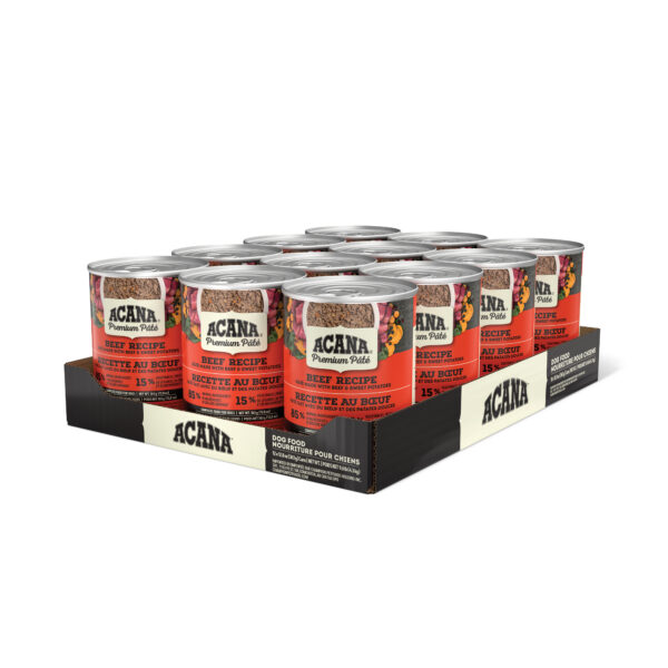 Satisfy your dog with nourishing and hydrating ACANA PREMIUM PÂTÉ Wet Dog Food! This premium wet dog food provides benefits in every bite, including immune health and skin and coat health. It also has a smooth, easy-to-eat texture dogs devour, plus it’s crafted with delicious bone broth. It includes 85% animal ingredients* balanced with 15% vegetables, fruit and nutrients*,**. Because we’re obsessed with every ingredient that goes into ACANA recipes, this wet dog food is crafted with protein-rich beef balanced with nutritious fruit and vegetables like sweet potatoes and cranberries. Enhance mealtime for your dog by feeding ACANA PREMIUM PÂTÉ wet dog food alone, or as a topper on their favorite dry food, and help them feel so good inside, you’ll see it on the outside! *Approximate values. **We also add natural preservatives, stabilizers and other nutrients. *Trace amounts may be present due to potential cross-contact during production.